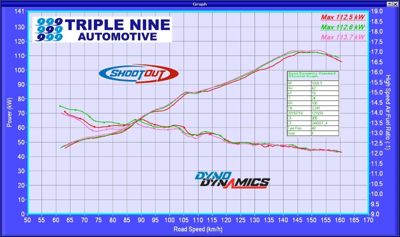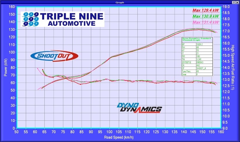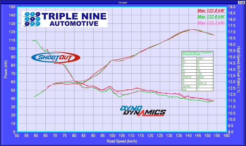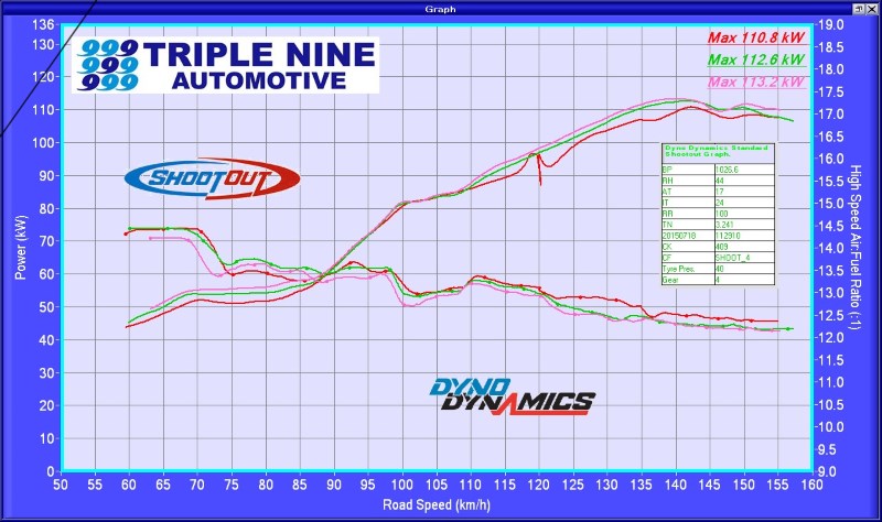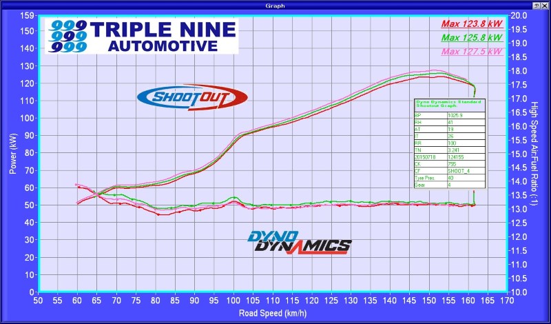 All graphs from the same dyno, same day (2015-07-18), same 20C intake air temp.