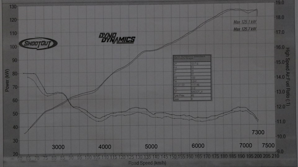 | Jul 2015 | v74 | First dyno day. OTS E85 UEL = 131kW, OTS E85 EL = 140kW. |