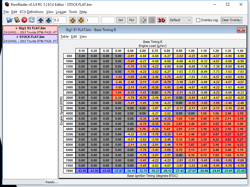 | Jul 2014 | OTS v2.0 | Revised Stg1 Added Stg2 91 AKI (93 AKI timing minus 1 deg over 6k rpm) Raised load limits from stock values - low RPM WOT now too rich instead of too lean. |